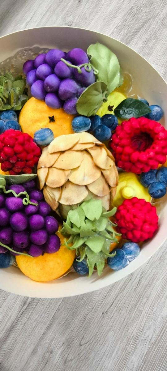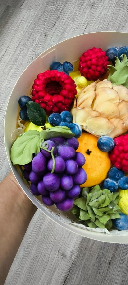 Зефирная композиция "Фрукты и ягоды" в коробке диаметром 23 см. из яблочного зефира. *Возможно исполнение вариантов вкусового зефира (цена по договорённости).
