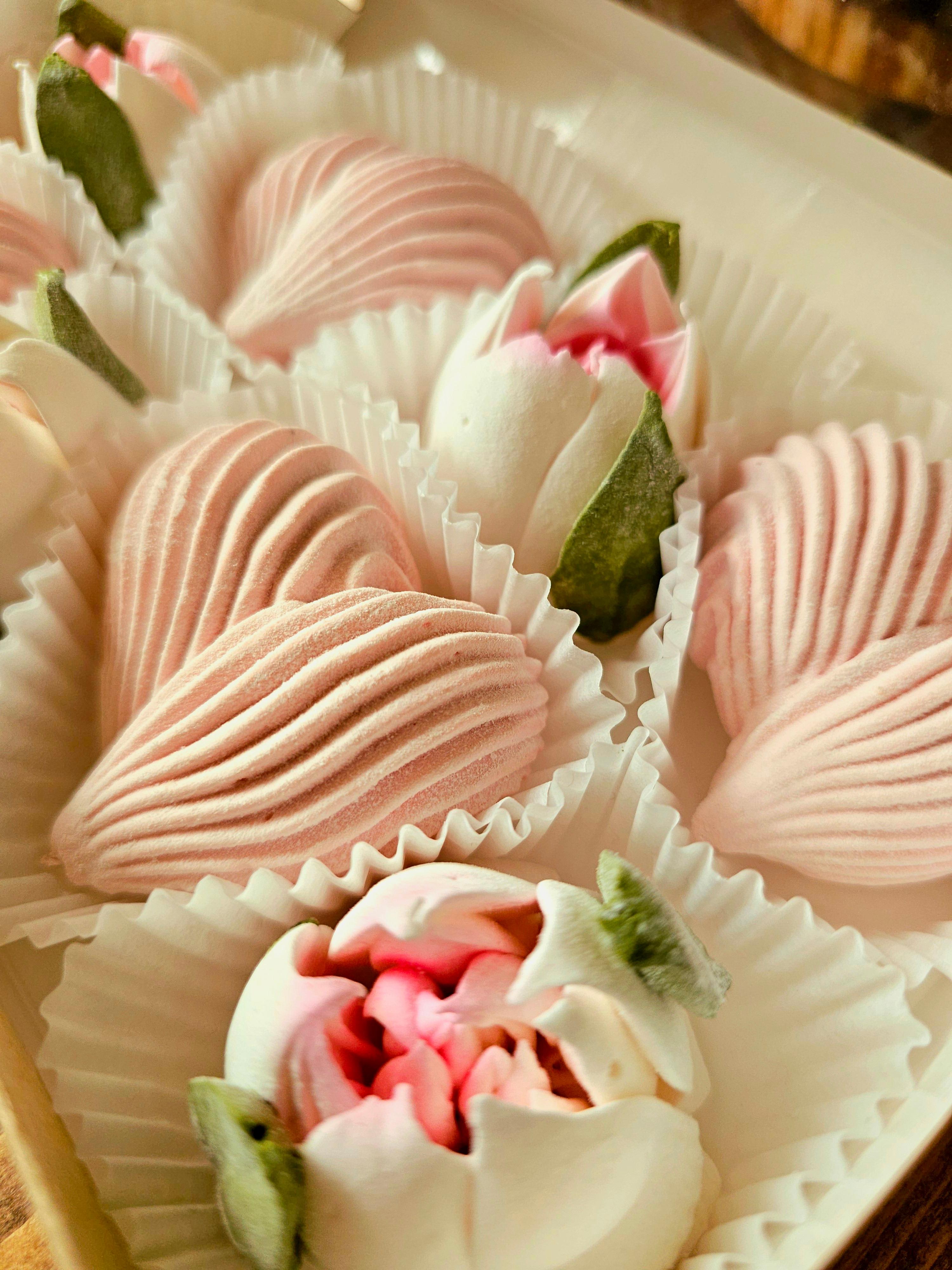 Коробка, 8 шт. Малиновые сердца и яблочные цветы *Дополнительно к основному составу добавляется натуральное пюре фруктов и ягод (в зависимости от вкуса)